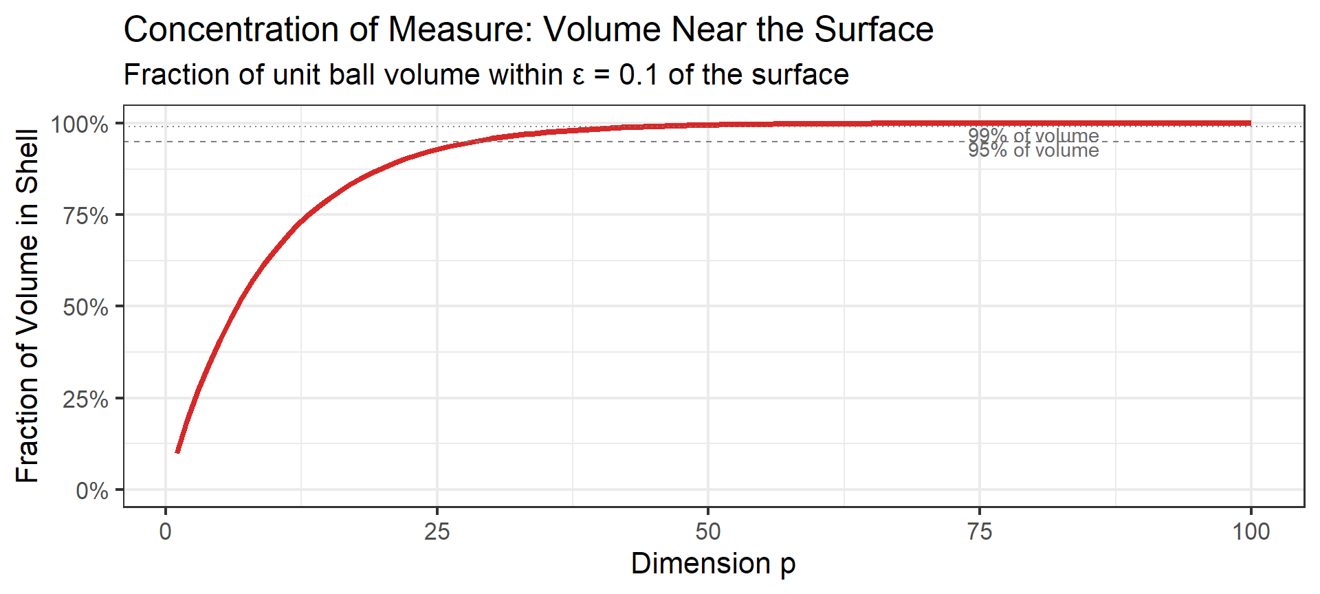 Perhaps the most counterintuitive result: most of a high-dimensional sphere’s volume is near its surface.