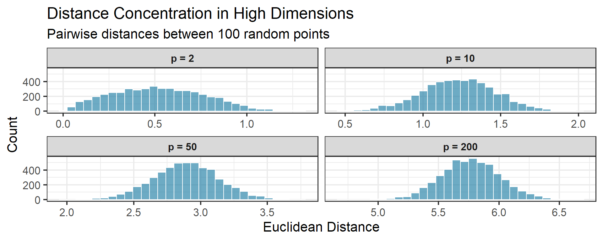 An even stranger phenomenon: in high dimensions, all pairwise distances become nearly equal.