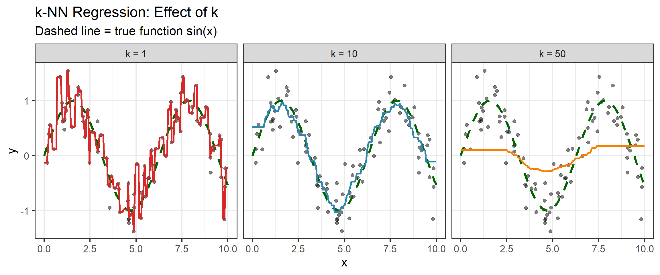 At the edges of the data (\(x \approx 0\) or \(x \approx 10\)), k-NN effectively uses a “half-neighborhood” — all \(k\) neighbors come from one direction. This causes: